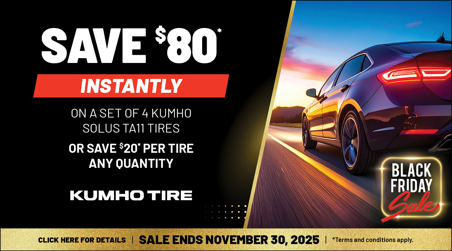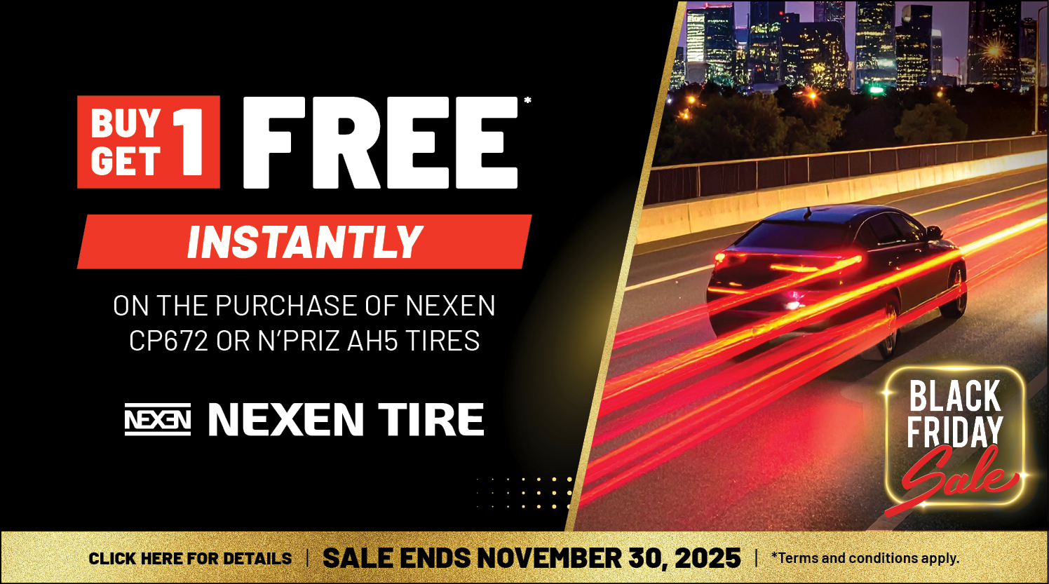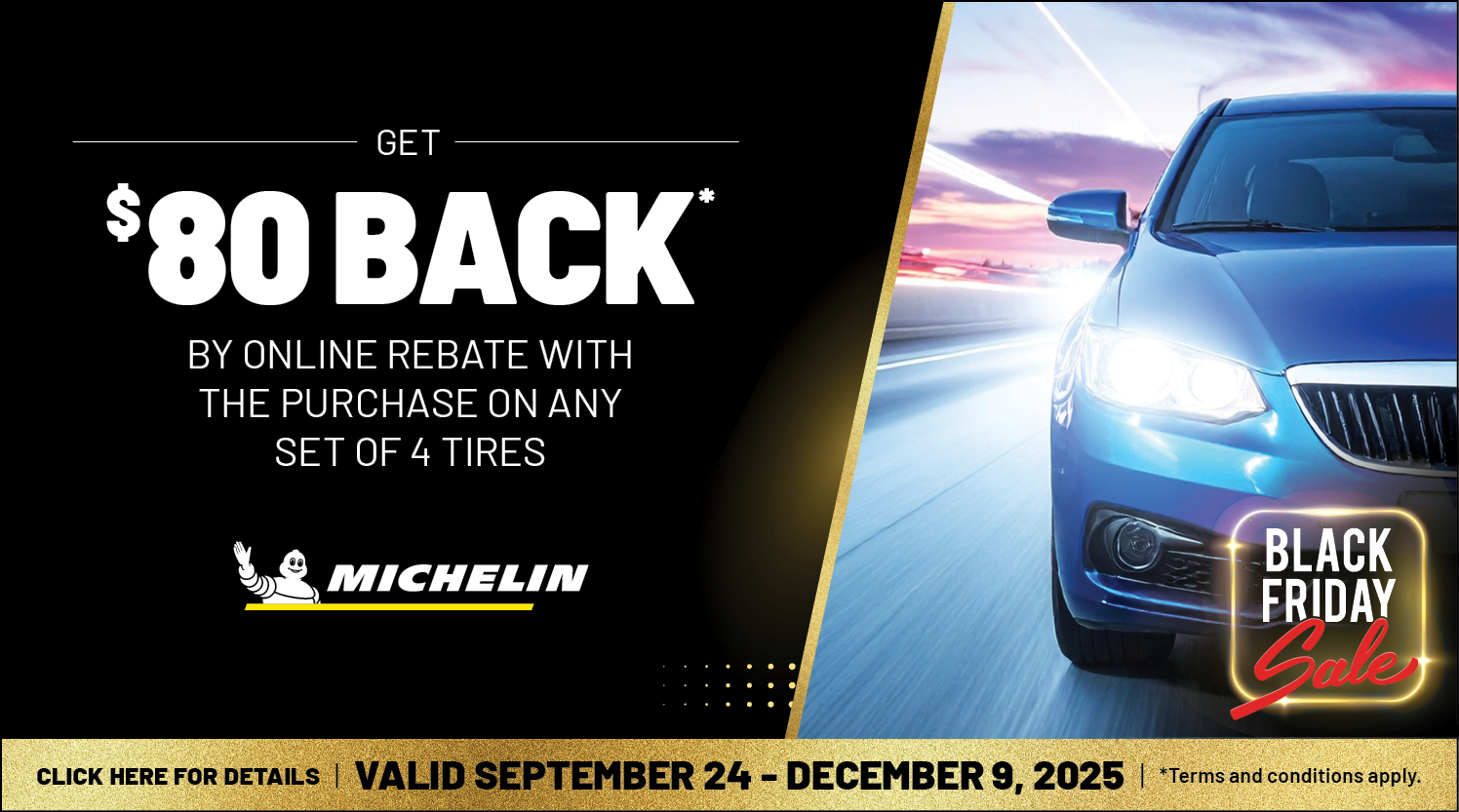 This Black Friday, the deals last longer and go further. All month long, get Buy 3, Get 1 Free on select Cooper tires and Buy 1, Get 1 Free on select Nexen tires. Plus, enjoy special savings on top tire brands like Michelin, Goodyear Kumho.
